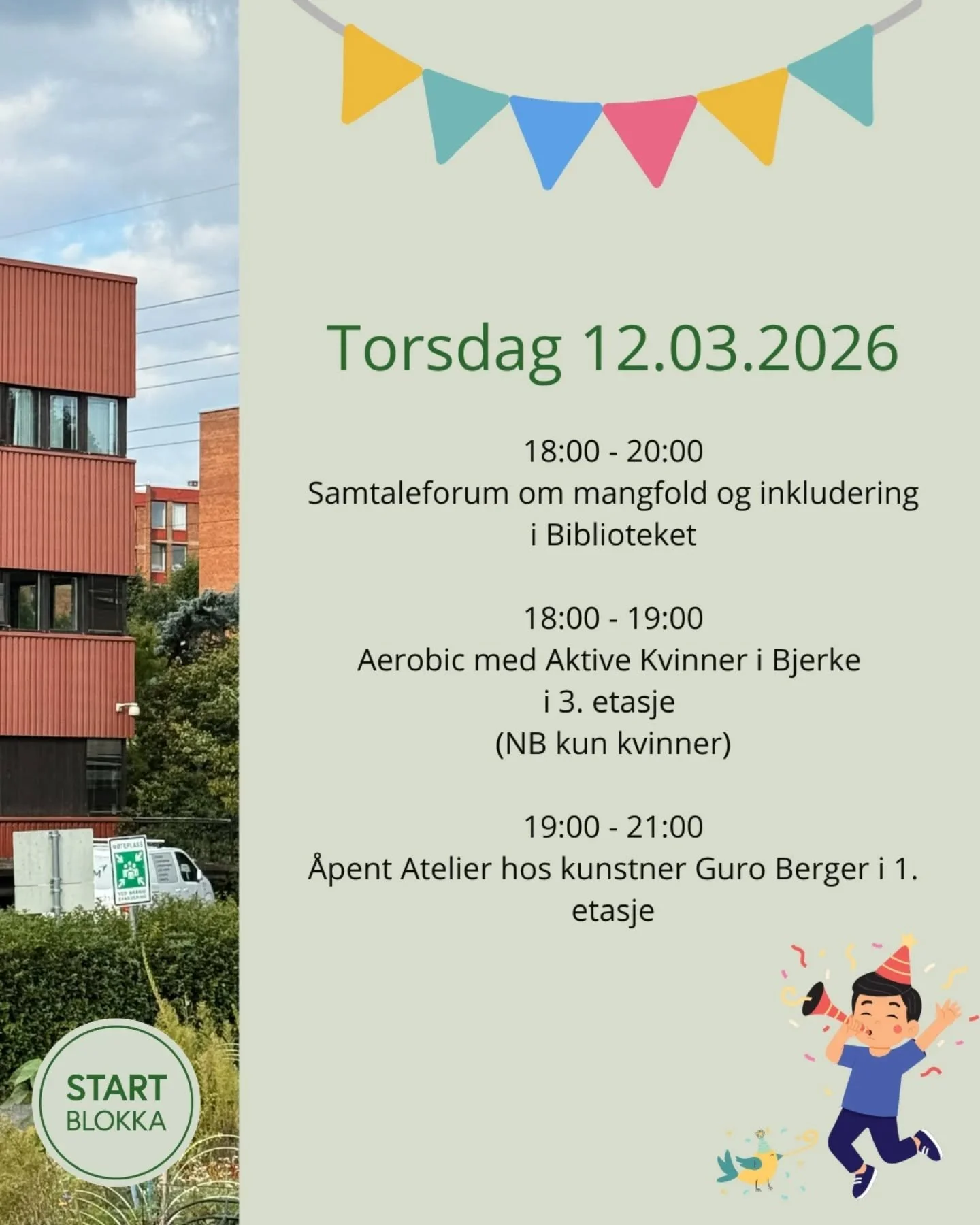 Velkommen til Startblokka! Startblokka er et sted du kan starte noe nytt - din egen arbeidsplass, nabolagsaktivteter eller arrangementer. Mer om Startblokka 12.03.2026 - 14.03.2026er det gratis aktivitetsdager på Startblokka Les mer om aktivitetsdagene her